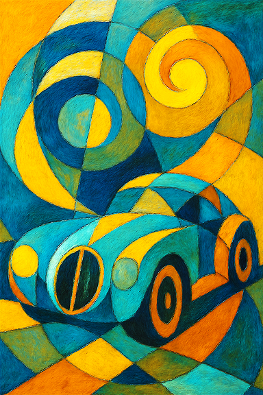 Une automobile transfigurée en galaxie, sa carrosserie se déployant en volutes cosmiques, comme si la route elle-même tournait autour d’un centre invisible.