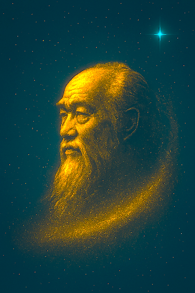 Un pèlerin de lumière avançant dans l’immensité cosmique. Sa silhouette dorée et blanche, simple et radieuse, laisse derrière elle une traînée d’étoiles chaque pas devenant constellation, chaque foulée une offrande au temps. Il porte sur ses épaules un petit sac de poussière d’univers, mais ne possède rien sinon le chemin qu’il trace.