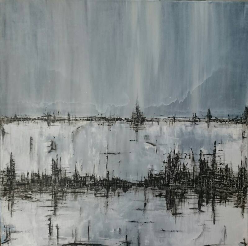 Dans mes peintures, je recouvre, gratte, inscris, jusqu’à trouver l’expression juste de mon regard. Dans la série « eau-rigine », que j’ai débuté en 2020, ma peinture devient plus abstraite, chaque couleur a une signification et un emplacement précis. Les points de peinture sont reliés avec un travail sur l’eau et la matière.